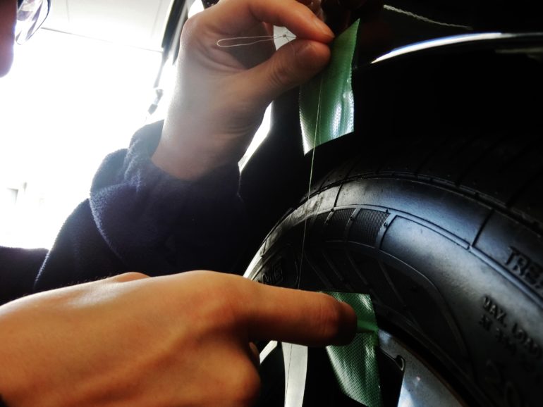 実車にて、フェンダーのクリアランスを測っていきます。