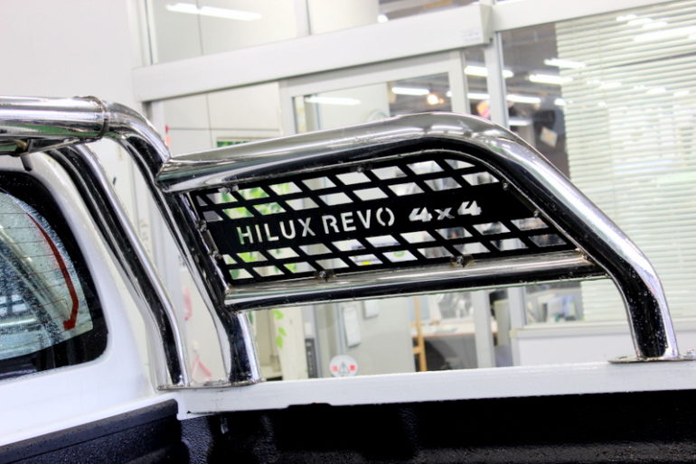 見てみるとハイラックスレボのロゴ入りスポーツバーが装着されているお車。