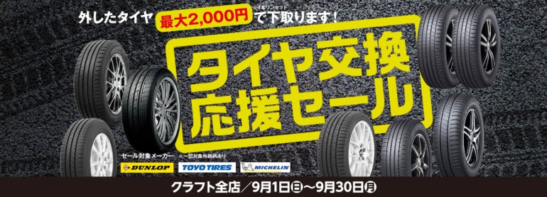 タイヤをお得に交換できる応援セール!対象メーカのタイヤを1台分(4本)購入して交換頂くと、なんと!! 外したタイヤ4本を最大2,000円で下取りいたします。対象タイヤメーカー※