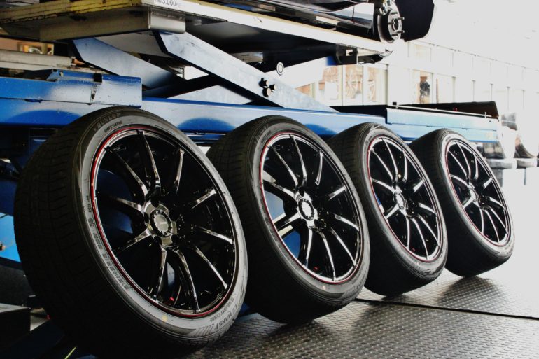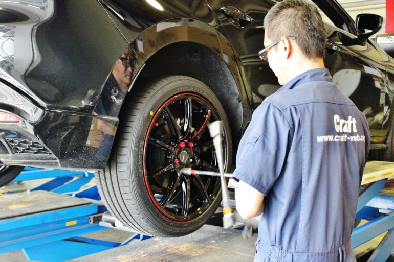 グロスブラックなスポークにリムエッジやRAYSロゴをレッドにカラーリング。