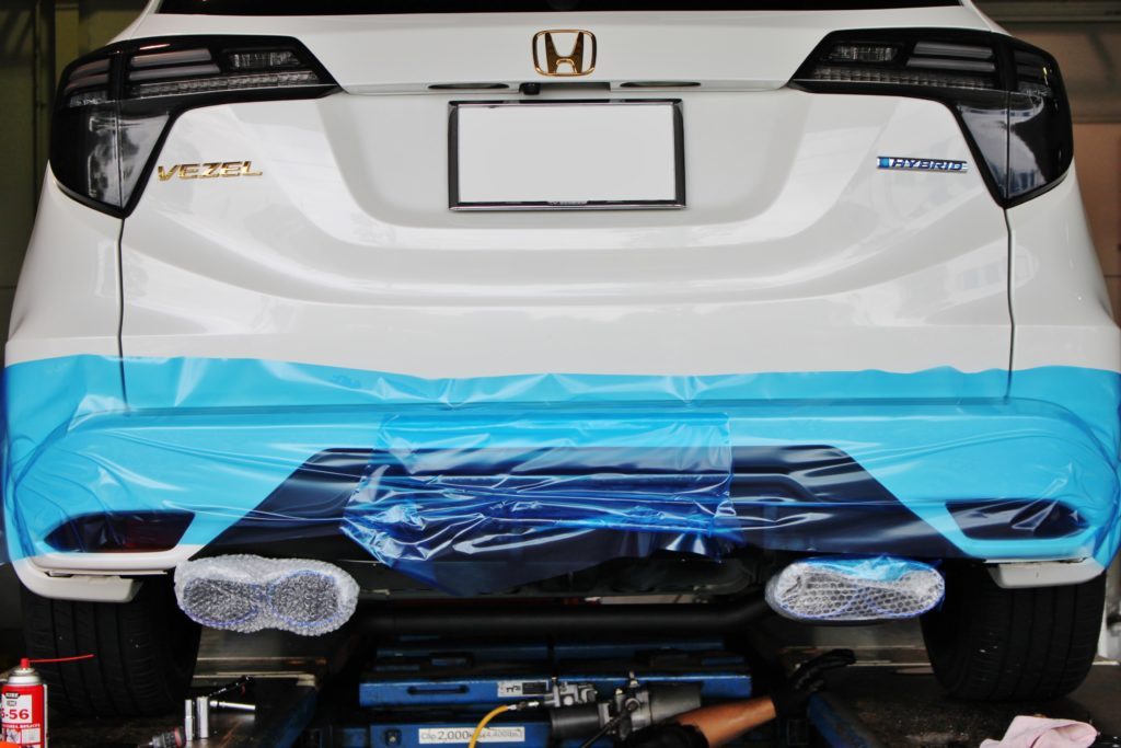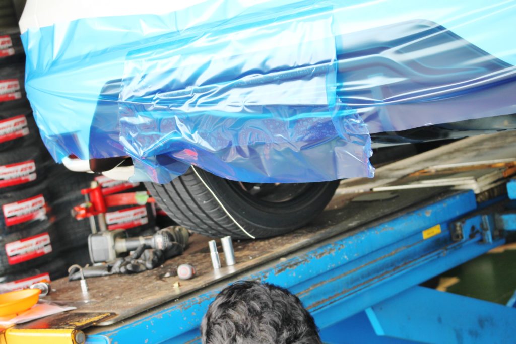 覆いこむようにバンパー共々養生シートをかけ、