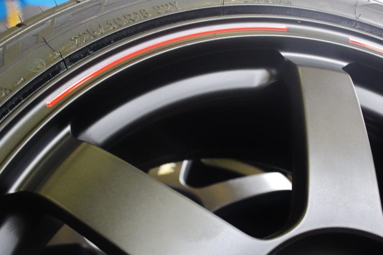 ディスクはマットブラック、リムの部分は赤色のREDOTが施されております。