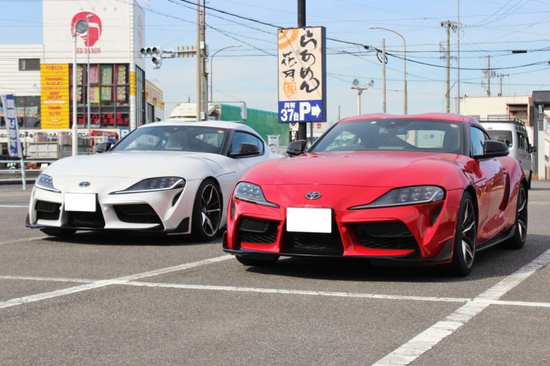 当店の白のGRスープラとオーナー様の赤のGRスープラ。