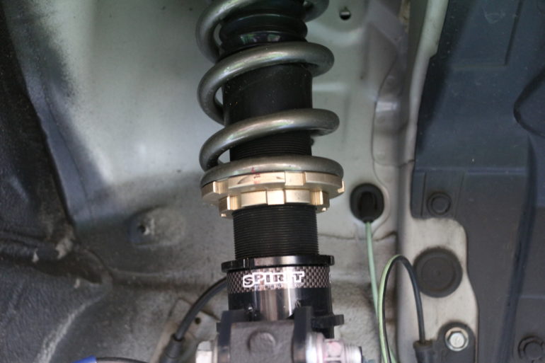 ワンオフ車高調で有名なスピリットさんの車高調が装着されており、