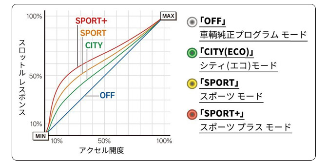 ノーマル状態では燃費改善などの為にあえてドライバーによるアクセル操作がコンピューターにより制御され