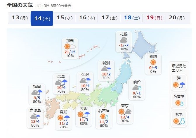 1月14日(火)の夜から翌日15日(水)にかけて積雪が予想されております。