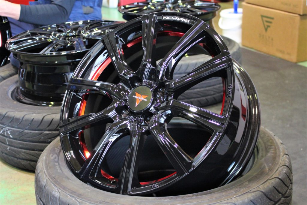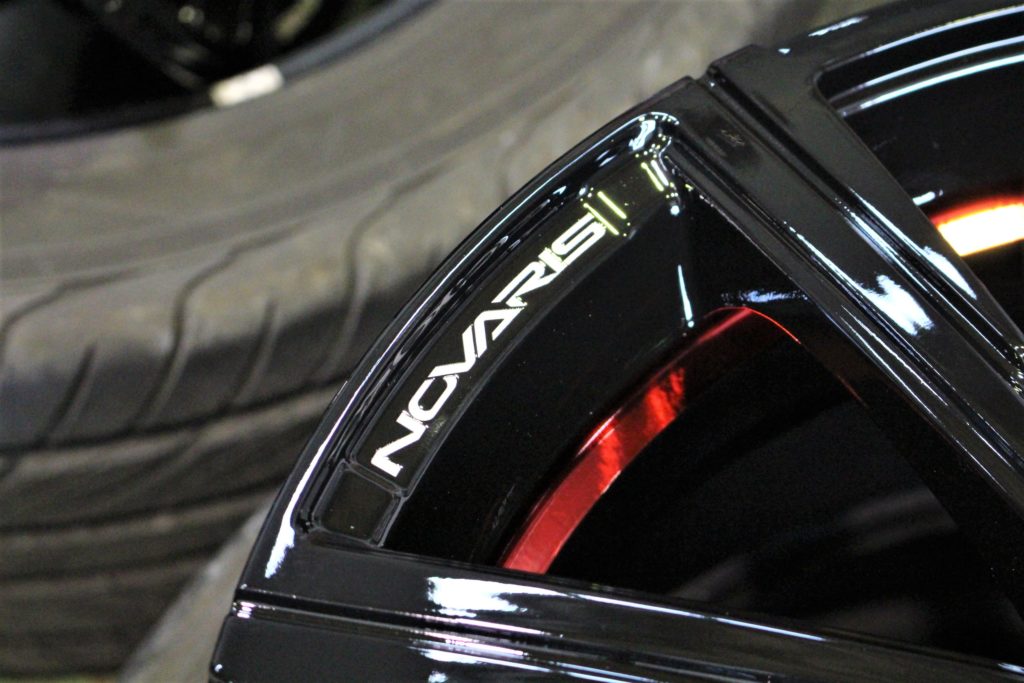 ホイールの大部分はグロスブラックで塗装され、差し色にレッドライン技巧が奢られます。