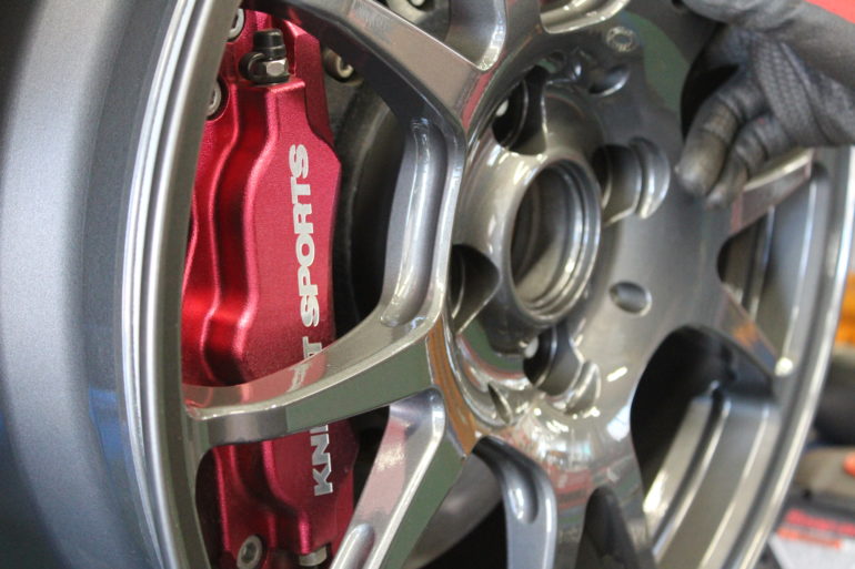 スリッド入りのローターや赤いビックキャリパーが顔をのぞかせており