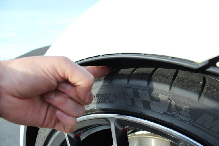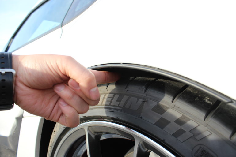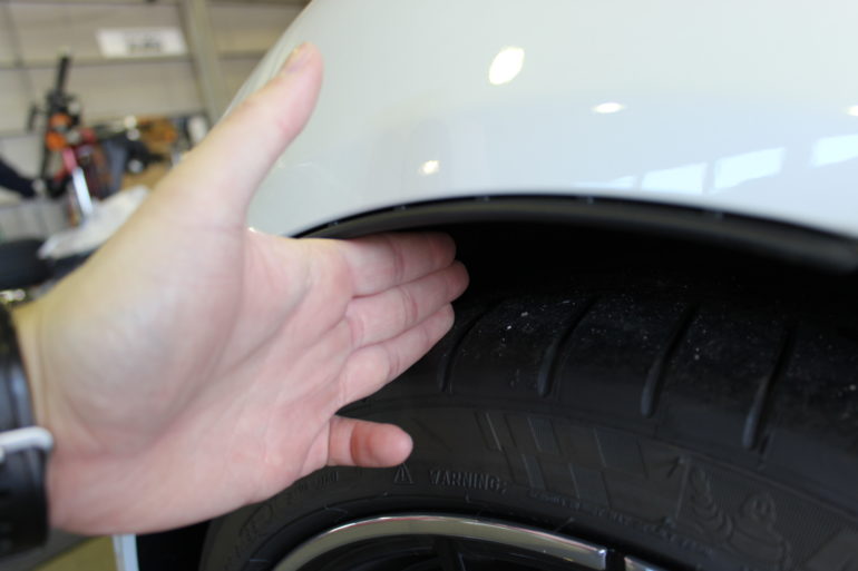 フロント側の装着前のタイヤとフェンダーとのクリアランスは指3本ほど