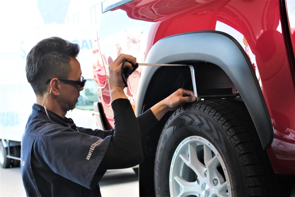 タイヤ下部からフェンダートップ。フェンダークリアランスそれぞれを確認し、