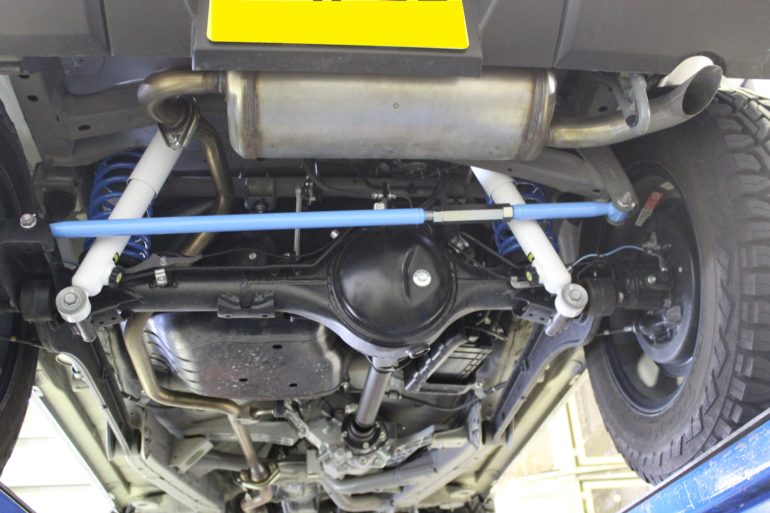 ジムニーなど一部の車種で車高を上げ下げした際にタイヤが左右に押し出されてしまうため、左右の出ヅラを調整するためのパーツがラテラルロッドです。