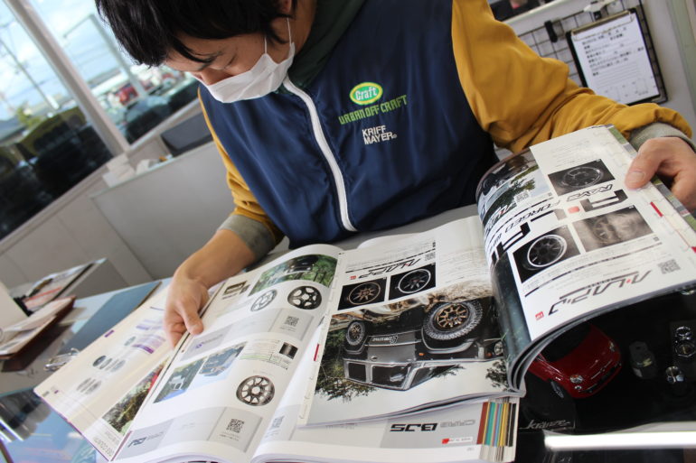 何やら ホイールのカタログとにらめっこを繰り広げる寺田店長