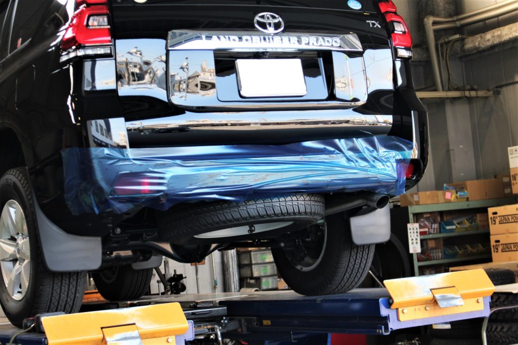 と、その前にヒッチメンバーの取付を。取付時にバンパーに傷が入らないように養生も。