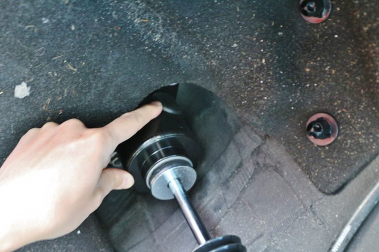 リアの調整は、マウント下部のゴムのフタを開けて、、、