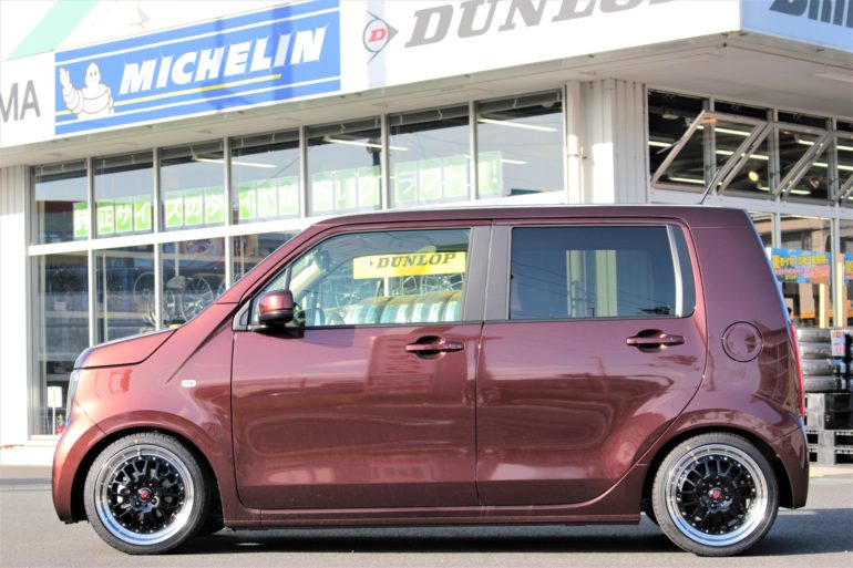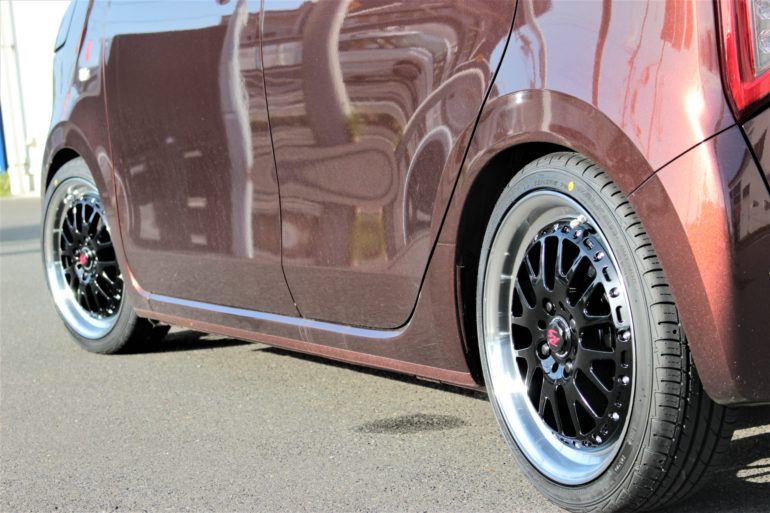 車高は地上高ギリギリを狙い、タイヤサイズも165/45-16を組み少し引っ張らせた仕様!!