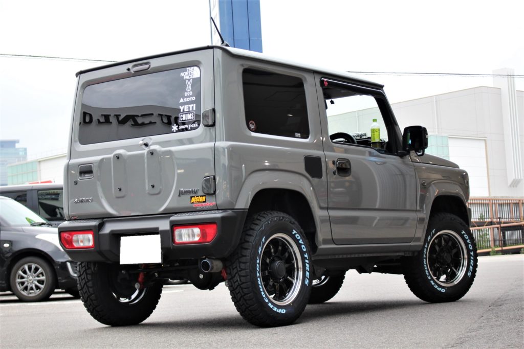 リフトアップ・マフラー・タイヤ&ホイールとカスタムパーツ盛り沢山なジムニー。