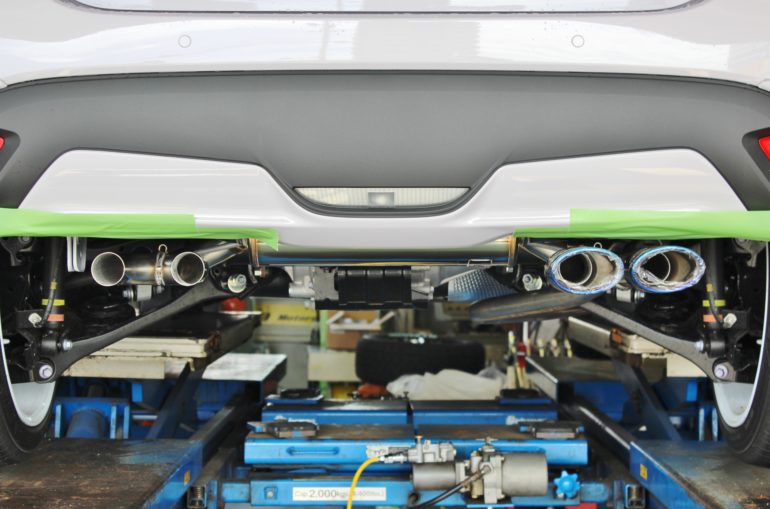 早速純正のマフラーを取り外し、BLITZのマフラーへ。