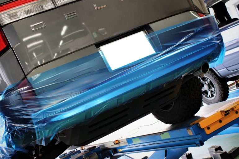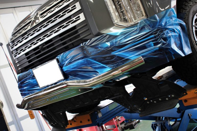 ボディにキズが入らないようバンパーにしっかり養生を行い慎重に作業を進めていきます