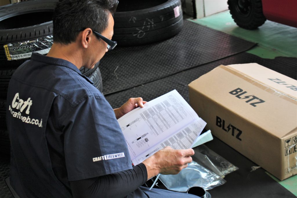 施工前にお客様ご希望の車高になるよう準備。