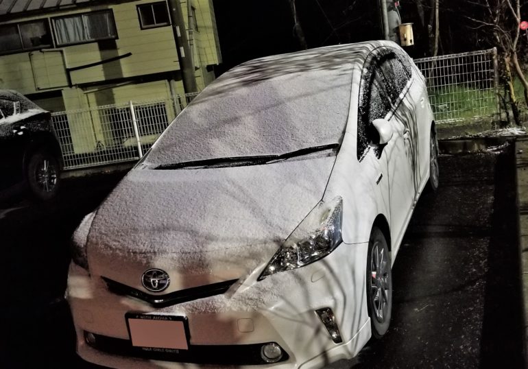 ボンネットやフロントガラスに雪と分る物体が積もっています。