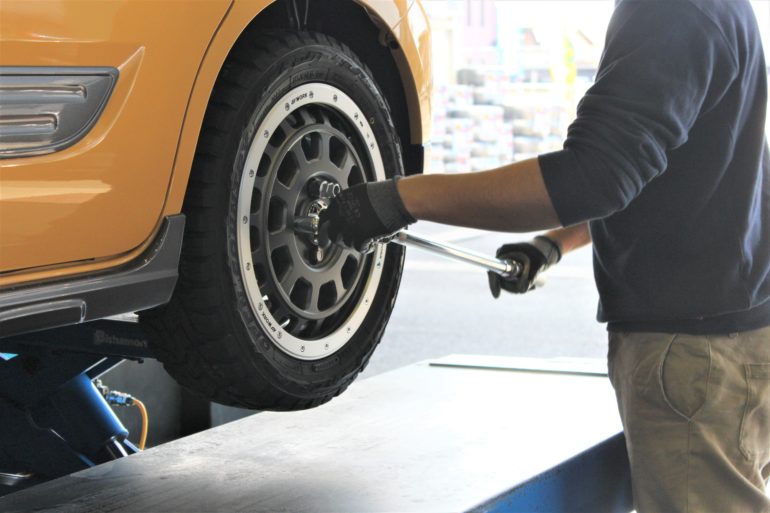 純正タイヤホイールを取り外し、NEWホイールセットに変更していきます。