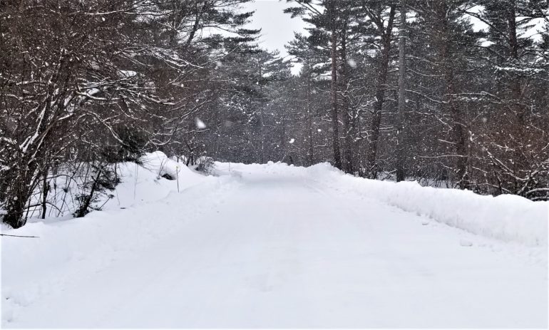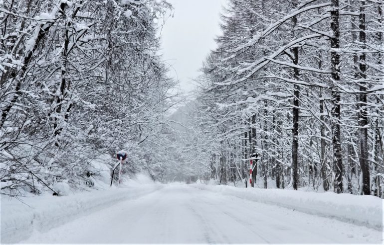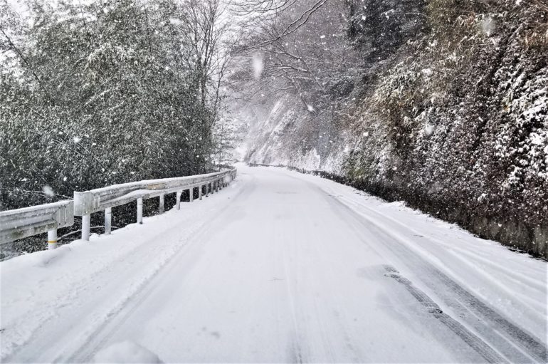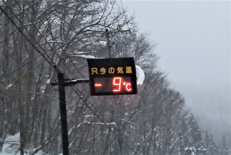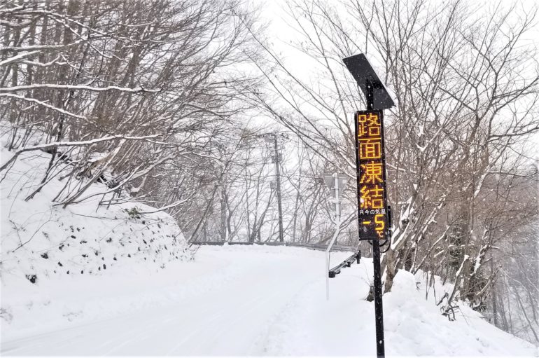 マイナス5℃ともなると路面はしっかり凍り、その上に雪が積もっていると言った状況。