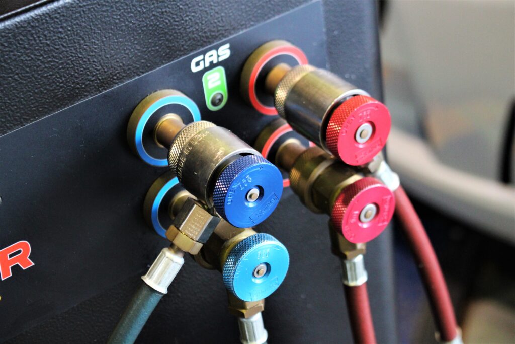 クルマのエアコンガスに含まれる不純物を取り除き、不足しているエアコンガスを規定値まで充填してくれるマシン。
