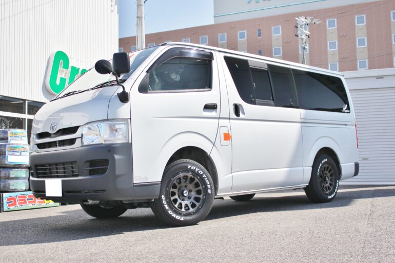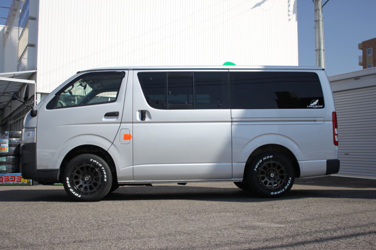 ハイエースサイズをホワイトレターのタイヤでパリッと決めていきます♪