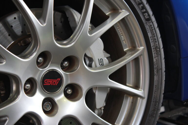 通常の現行STIは黄緑色?のキャリパーカラーですが、