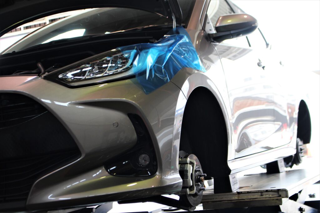 バンパー部に傷がつかないように養生を行い作業を進めます。
