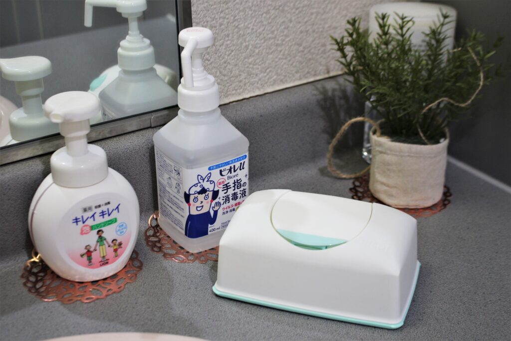お手洗いには薬用泡ハンドソープ、消毒液、除菌ウェットシートを配備済み。