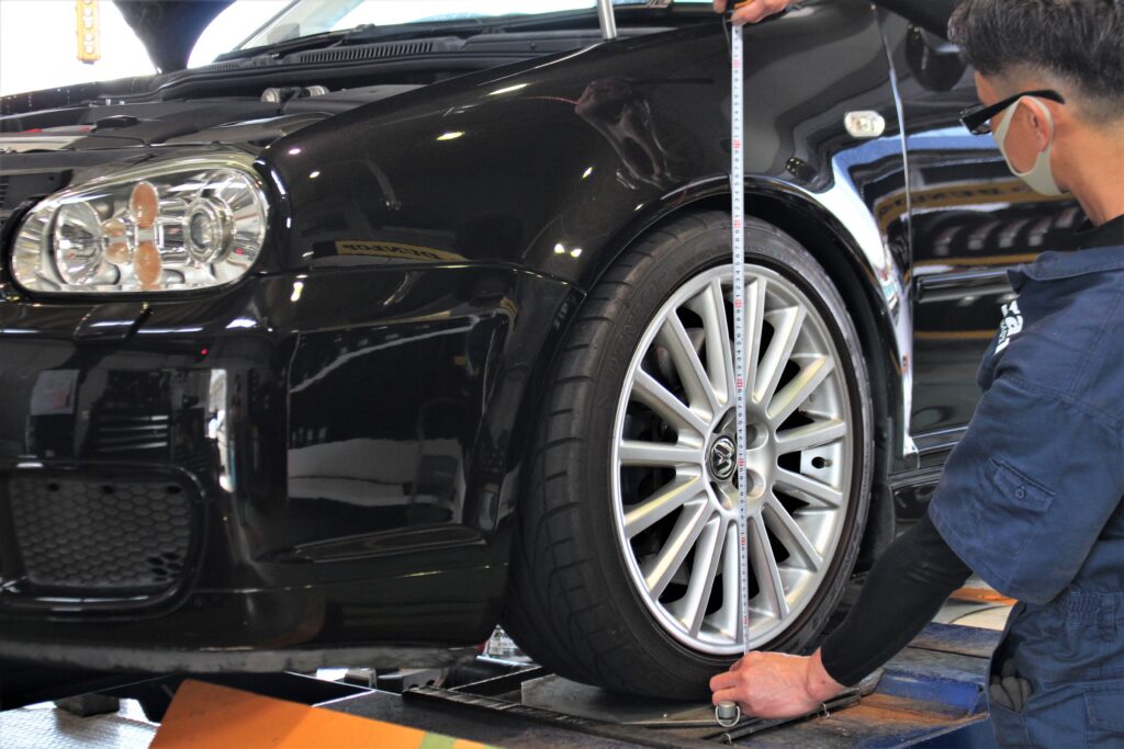 ST車高調取付後は、お客様希望車高になっているかを前後左右で確認。