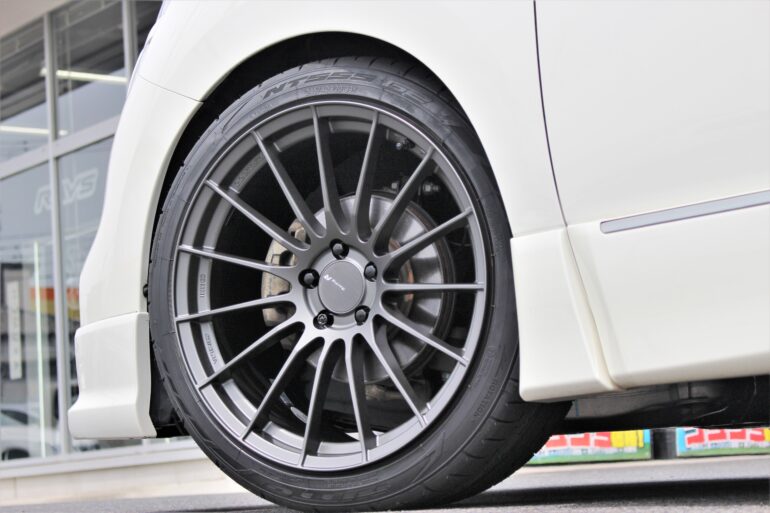 E52エルグランドにエンケイRS05RR 9.5Jコンケイブフェイスを装着する。