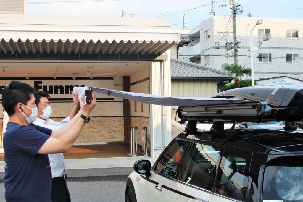 使用方法として、まずは格納されているオーニングをクルクルと引き出していきます。