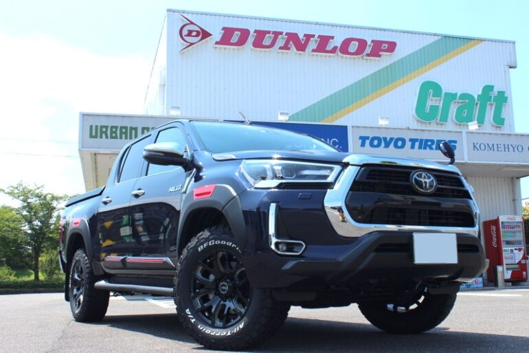 ハイラックスは 「 265/70R17 」 でも干渉するクルマ。。。 今回はJAOSマッドガードとの関係性も考慮しながら仕上げましたよぉ~✨     いつもありがとうございます、クラフト厚木店・佐藤です!!   本日のご紹介は、千葉県からお越しのT様・ハイラックスGRスポーツ。   ハイラックスと言えば、当店でもご相談が多く、今までにも多くの施工を行って参りました。   今回はその経験から得たノウハウで、オーナー様のご希望をしっかり叶える事が出来ましたよぉ~✨   それではコチラをどうぞ!!     T様からのご依頼は 「 タイヤ・ホイール交換 」 & 「 前下がりの補正(リフトアップ) 」 となります。   装着したリフトアップアイテムは 「 JAOS BATTLEZ リフトアップセット VFCA Ver.A 」 となり、車高の調整機能が備わっているモデルをチョイス。   今回オーナー様からいただいたご希望をクリアするには、この 車高調整式 と言う機能が必要だった訳です!!     上の画像はご入庫時のノーマル車高になります。   いたって普通のHILUX GR SPORTでしょうかね 👀👀   言ってしまえば、HILUX特有の前下がり感が見て取れます。。。   そして、ブレーキキャリパーとカラーを揃えたマットガードも装着しています。   今回はこの 「 マッドガードを装着している 」 と言う点に注意を払い、アイテム選びやセッティングを行いました🔧🔧     続いての画像は完成後のハイラックス。   見ての通り、車高が補正され、前下がり感もなくなっていますよねっ✨   前下がりの補正だけを考えた場合、同じくJAOSさんからリリースされているリフトアップコイルでもOK。   ですが、今回はタイヤサイズアップとそれに伴うマッドガードへの干渉も考え VFCA Ver.A を装着したんですよね。。。     まず、ハイラックスはタイヤサイズを大きくするとすぐに干渉問題が発生するおクルマ。   なので、どの位のリフトアップ量に仕上げるのかがとても重要!!   GRスポーツの場合、純正タイヤサイズが 265/60R18 となりますが、265/65R18 や 265/70R17 と言ったワンサイズアップ程度でも干渉問題がつきまとうんですよね。。。   しかも、ノーマル車高ではなく、リフトアップを行っていたとしてもです。汗     リフトアップを行っていないならともかく、リフトアップを行っているのに 「 ワンサイズアップ 」 も出来ないなんて、何だか残念ですよね。。。   ちなみに、干渉問題が発生するのは 「 フロント 」 のみとなり、更にはハンドルを切った時に限定されます。   そんなおクルマだからこそ、JAOSさんからインナーフェンダー加工KITが商品化されているんでしょうね 👀   それでは、HILUXはタイヤサイズを大きく出来ないのか??ってところですよね。   答えは 「 NO 」 です!!     当店でも 「 265/70R17 」 と言う定番サイズを筆頭に 「 275/70R17 」 や 「 285/70R17 」 などの2~3サイズアップまでのサイズはご要望も多く、多くの装着事例があります 👍   ですが、今回はJAOSマッドガードを装着しており、その部分の干渉を避けたいと言うご要望を加味しながらアイテムをチョイス!!   まずリフトアップアイテムに VFCA Ver.A をチョイスしたのは干渉を防ぐために 2.5インチ 程のリフトアップを行う必要があった為。   ちなみに、この仕様(リフトアップ量)の事を当店では 「 ちょいアゲ仕様 」 と呼んでいます。笑   ちょいアゲと言っても少し上がる訳ではなく、迫力の仕上がりとなりますよぉ~✨   そしてハンドルを切った際の干渉を抑える為に 「 265/70R17 」 と言うタイヤサイズをチョイス👍   この組み合わせにより、施工後もタイヤとマッドガードの干渉を抑える事も出来、オーナー様のご希望を叶える事に成功したと言う訳です。   そしてもう1つの拘りが出ヅラになります👀👀     上の画像のように、しっかりリフトアップを行った事で、タイヤサイズを大きくしながらもマッドガードへの干渉は回避。   そして最終ミッションはハイラックスGRスポーツのワイドフェンダーにマッチするホイールサイズの提案です!!   本日装着の RAYS DAYTONA D325 は見ての通り、オフ感漂うアイテム。   ですが、その良い雰囲気も出ヅラ次第では良さを引き出しきれないんですよね。。。   そんな訳でホイールサイズにも拘って仕上げた出ヅラがコチラ!!     前後ともに、キレイな出ヅラへと仕上がっていますよね!?   タイヤのサイドウォール部でギリギリの出ヅラ、これぞツライチと言った仕上がりっ 👍   特にHILUXは1ナンバー(普通貨物)の登録の為、プラドやランクル250などの普通乗用車とは基準が違います。   要は 「 タイヤ(ゴム部)の突出も許されない 」 クルマなんですよね。。。汗   そんな事から、今回のカスタムはリフトアップ量の計算や干渉を抑える為のタイヤサイズ、更には出ヅラと言った多くの計算が必要となるカスタム事案だった訳です。   そんなちょっと高度なミッションでしたが、当店で行ってきた多くの施工事例から得たノウハウで無事施工完了っ👍   これから愛
