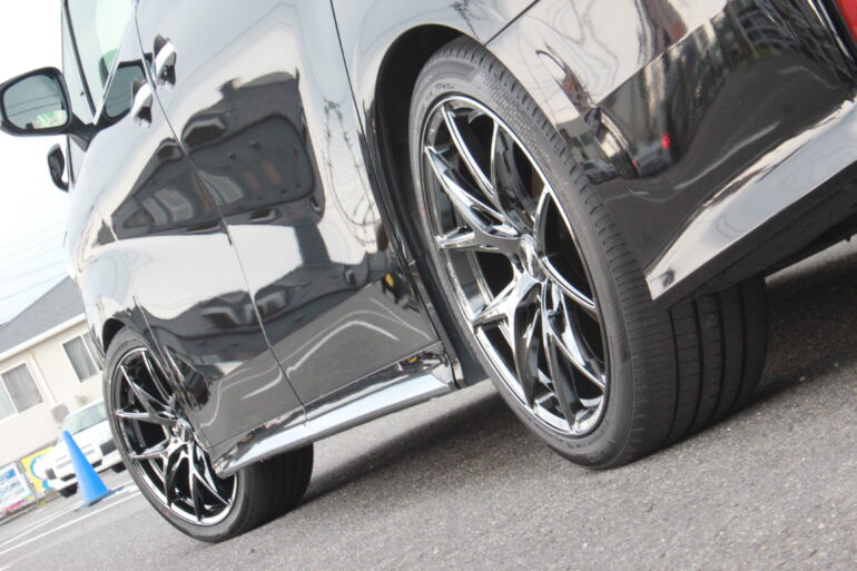 ホイールカラーはジェットブラックで黒味の効いたスパッタリングメッキが上品さもありつつ主張もあるので