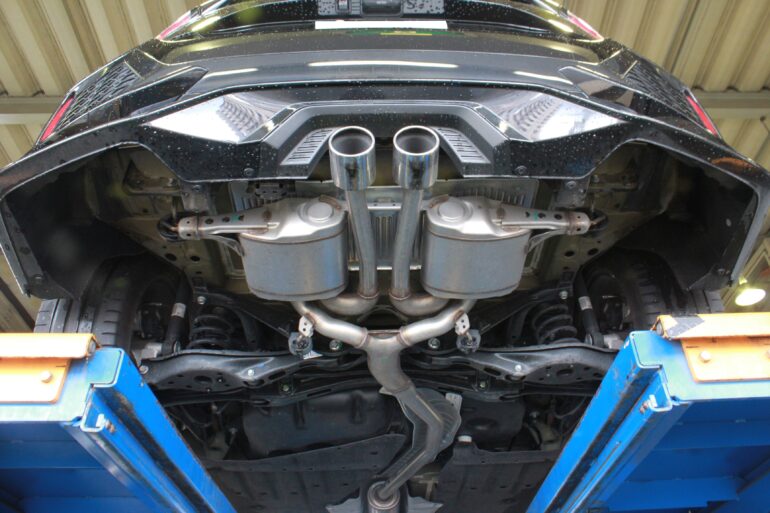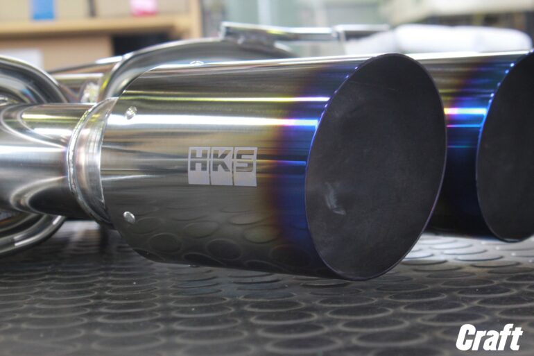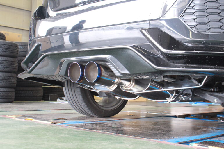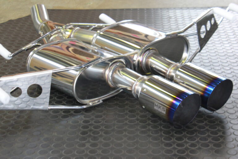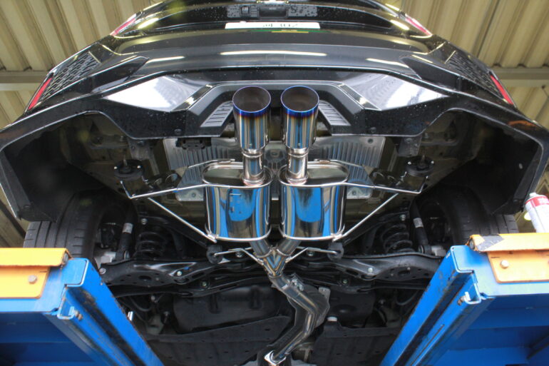 純正のマフラーを取り外し、分割しているマフラーを取り付け