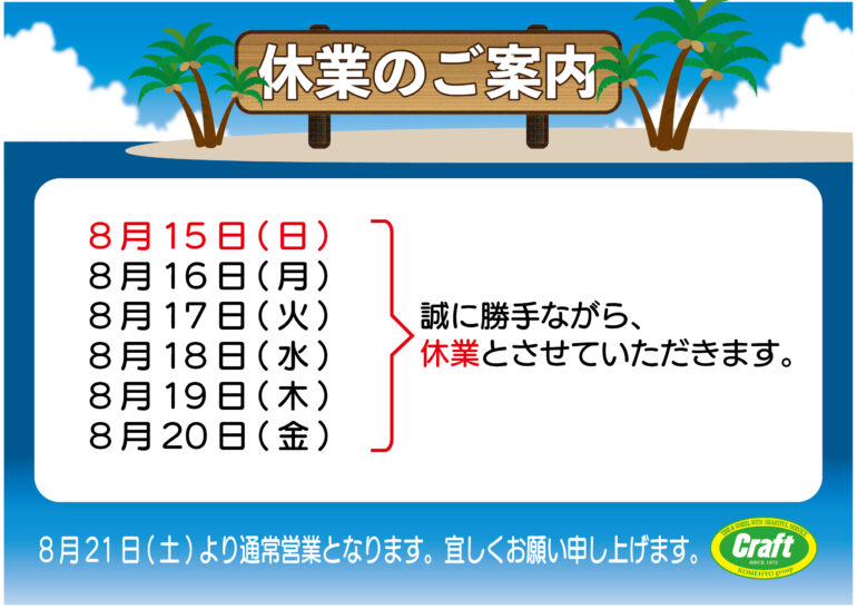 クラフト全店夏季休業とさせて頂きます。