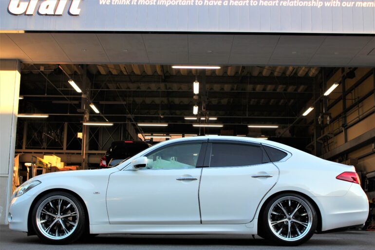 ブラックボディーの足元に、艶やかに輝くシュヴァート・クヴェル。 フーガならではの深リム仕様が完成しましたよっ✨     いつもありがとうございます、クラフト厚木店・佐藤です!!   本日のご紹介はY様・51フーガ。   すでに20インチを装着されておりましたが、もっと深いリムを求めてのホイール交換ですっ♬♬     そこで、ご購入いただいたホイールがコチラ。   WORK シュヴァート・クヴェル 20インチ。   タイヤサイズは 245/40 & 275/35 を使いますのでホイールリム幅も前後違いでご用意させていただきました。   ちなみに、リム幅は 「 9.0J & 10.0J 」 となります!!     WORKの中でも シュヴァート シリーズはリムの深さを追求しているモデル。   なので、リムを深く取りたいとお考えだったY様にはピッタリのアイテムなんです!!   シュヴァートと言えば歴史のあるアイテム、10年位前には SC4などSCシリーズが爆発的に売れていたんですよね。。。   そんなシュヴァートシリーズも時を経てリニューアル✨   今では本日装着のクヴェル、そしてSGシリーズへと進化しています。     Y51フーガと言えばビッグキャリパーを装着しているグレードもありますよね!?   そこで、リムを深く取りたいとお考えの皆様に知っておいていただきたい情報があります。   ニッサン車にはフーガに限らずビッグキャリパーを装着しているおクルマがあります。   フェアレディZやスカイラインもそんなおクルマですかね。   そして、本日装着のシュヴァート・クヴェルなど  マルチピースホイール  には ビッグキャリパー用 と 通常キャリパー用 が存在します。     どちらも見た目は同じですが、リムの深さではビッグキャリパー用より通常キャリパー用の方がリムが深く取れる仕組みとなっています。   なので通常キャリパー車には通常キャリパー用を装着し、少しでもリムを深く取った方が良いって事!!   インターネットでの購入の場合は少し難しいかも知れませんが、その辺に注意しながら購入する事をお勧めしますよっ 👀   難しい事は分からない。。。そんなオーナー様は失敗する前にクラフト厚木店までご相談下さいねっ♬♬     Y様フーガは車高調にてローダウンを行っているおクルマ。   ですが、前後のバランスがちょっと気になっていたとの事。。 👀   そこで、ホイールチェンジのついでに車高もリセッティングしちゃいましたよっ🔧🔧   車高調だからこそ可能となる車高の微調整。。。   細かい所にも手を加え、満足度の高い愛車へと進化したのでしたぁ~✨     Y様、この度はご利用誠にありがとうございました。   今回のホイールはバッチリ深リムを実現出来ましたよねっ 👍   そして、満足度を高める為の車高調整によりバランスの良い愛車へと変身しましたねっ♬♬   念願だったこのリムの深さ。。。ずっと眺めていられますよね。笑   それでは楽しいCarライフをお送り下さいね、またのご利用よろしくお願いしま~す☆☆