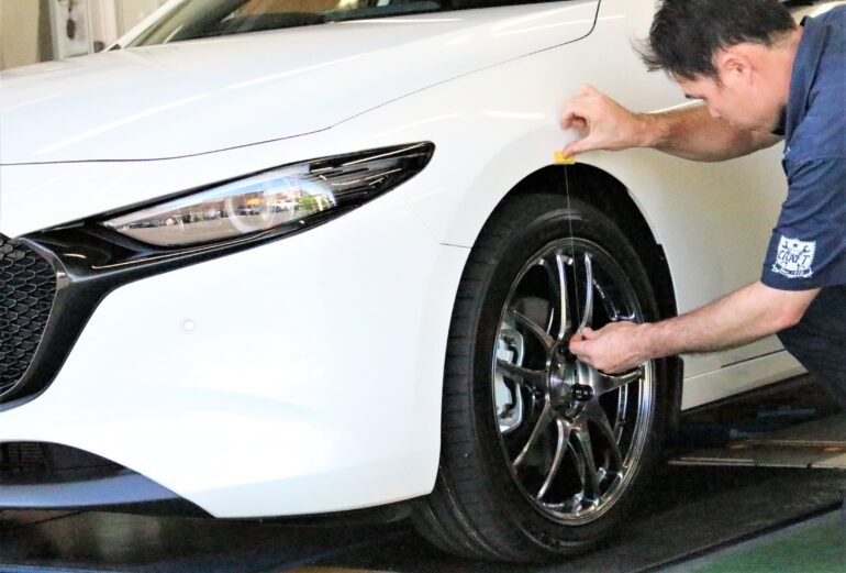 フェンダーから糸を垂らしてホイールが突出していないかを確認 👀