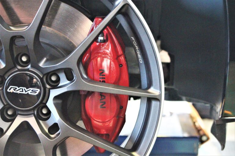 装着前に4POTキャリパー&ハブが逃げるかをスタッフ2名以上で確認。