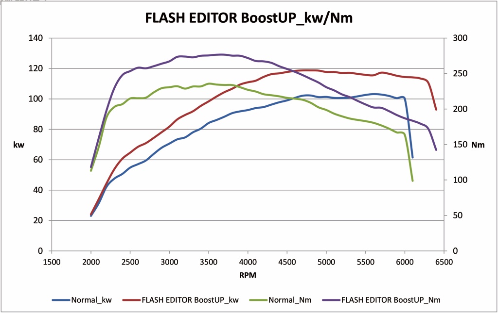 フラッシュエディターにより過給圧はノーマル1.05キロから1.3〜1.35キロに引き上げられ、