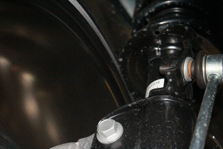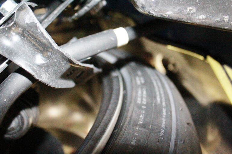 先代の86/BRZのホイールカスタムでも9.5Jクラスのホイールを装着した際、干渉が懸念されていたブレーキホースのステー。