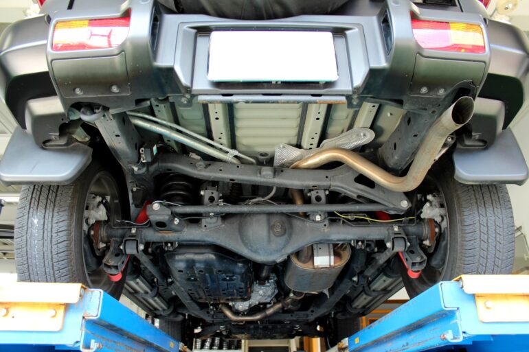 純正マフラーは若干下向きにセットされており、パイプ径は太いものの少し寂しげ。