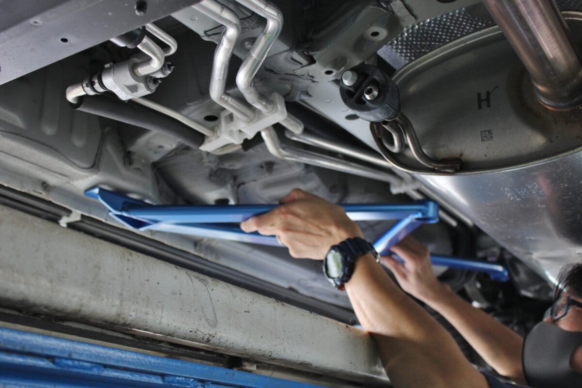 今回は、クスコのパワーブレース フロアーサイド&ストラットタワーバーを装着。