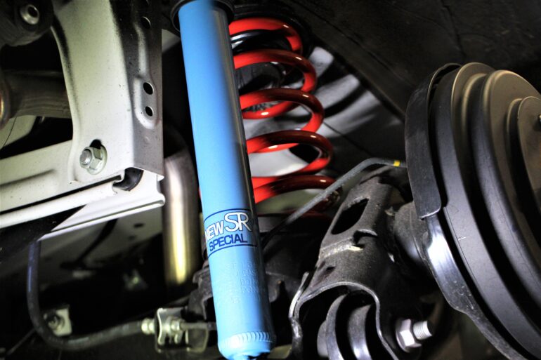 この青いダンパーと組み合わせるのは、赤いスプリングが印象的なタナベスプリング。