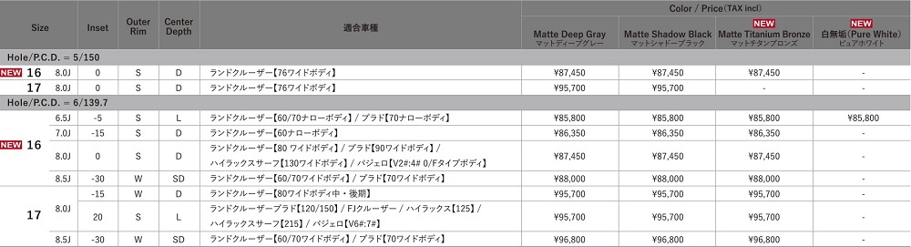 ピュアホワイトは16×6.5J 6H139.7 インセット-5 のみラインナップになっており、