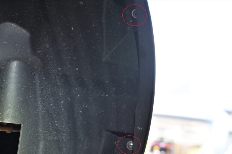 インナーフェンダーを固定しているビス2本を外します(赤丸部分2か所)。