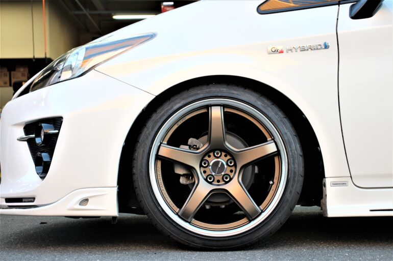 今回はフロント側のホイールサイズをギリギリまで調整し設定する事で、見た目に違和感が出ない出面まで持って行き