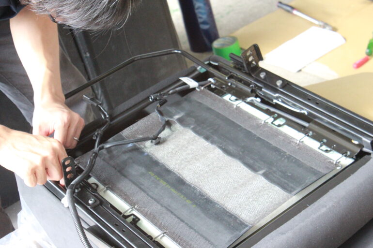 シートベルトバックルなど純正から流用するパートもしっかり移植。